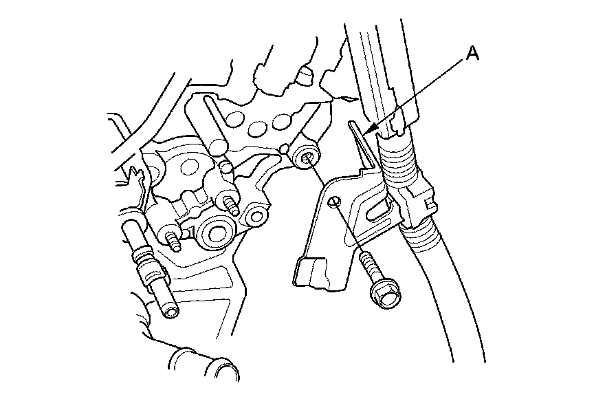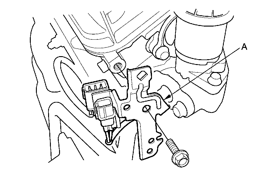 45. Remove the connector bracket (A) from the front cylinder head; use the bracket bolt hole to attach the engine hanger balance bar front arm.