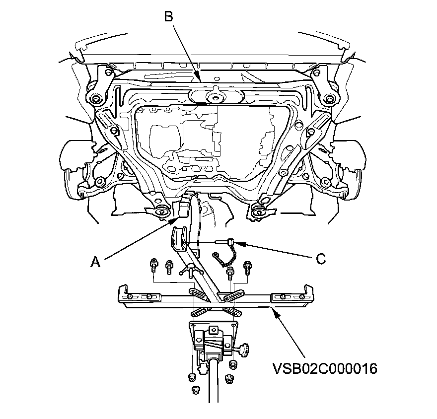 57. Attach the subframe adapter (VSB02C000016) to the front subframe by looping the belt (A) over the front of the front subframe (B), then secure the belt with its stop (C).