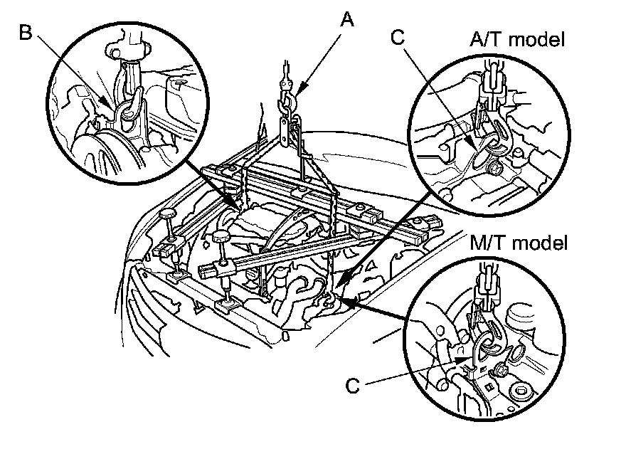 61. Attach a chain hoist (A) to the engine hanger (B) and the transmission hanger (C), then lift the engine/transmission until it is securely supported by the chain hoist, and remove the engine support hanger and the engine hanger balance bar.