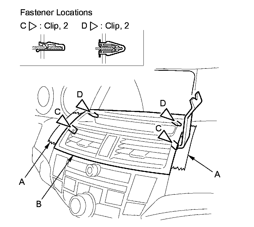 1. Apply protective tape (A) to the dashboard middle pad beside both side edges of the dashboard center vent (B). Pry up on the edge of the center vent with the appropriate trim tool to detach the clips (C, D).