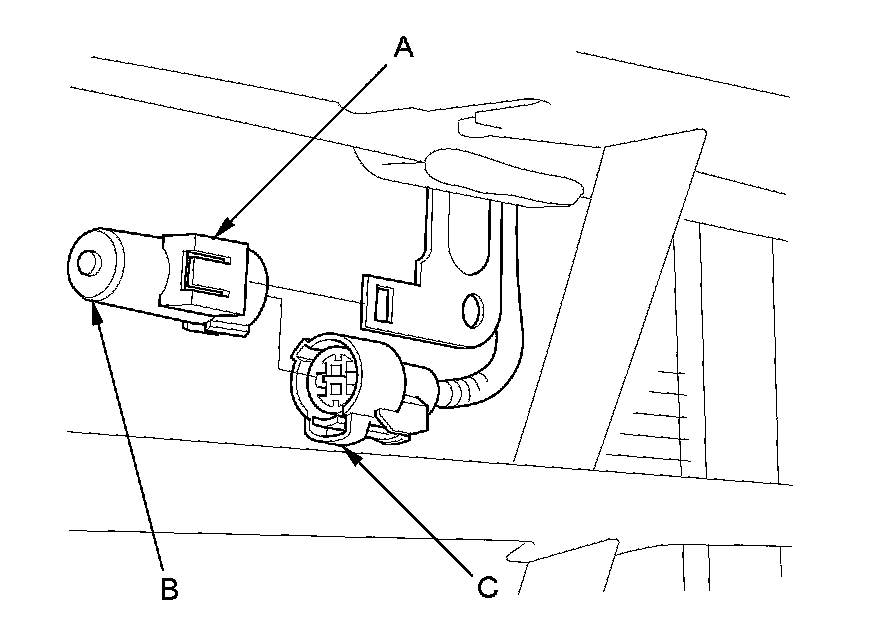 1. Lift the tab (A) to release the lock, then remove the outside air temperature sensor (B) from the front bumper beam. Disconnect the 2P connector (C) from the outside air temperature sensor.