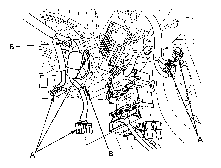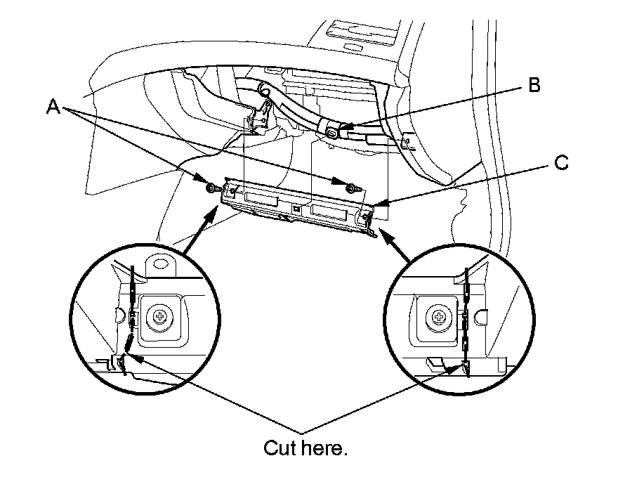 5. Remove the bolts (A) and the wire harness clip (B). Then cut the plastic cross brace (C) in the glove box opening with diagonal cutters in the area shown. Retain the plastic cross brace to be reinstalled later.