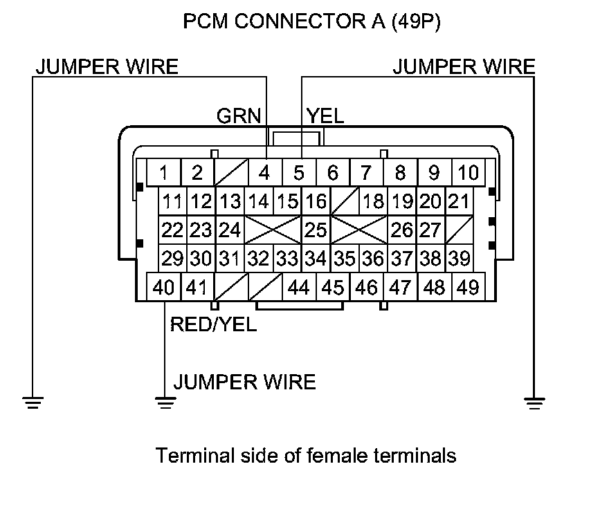 7. Connect PCM connector A (49P) terminals No. 4, No. 5, and No. 40 to body ground with jumper wires individually.