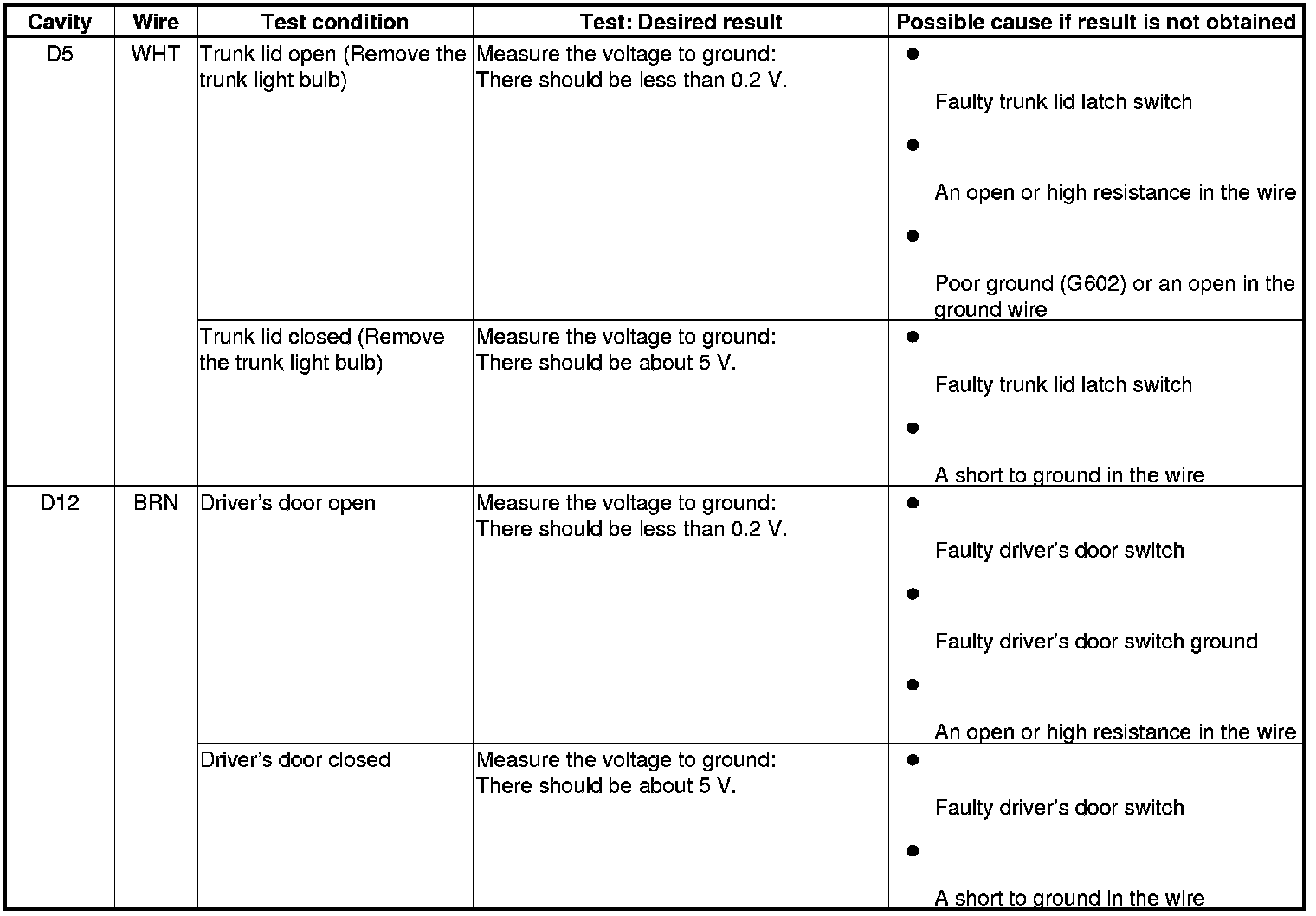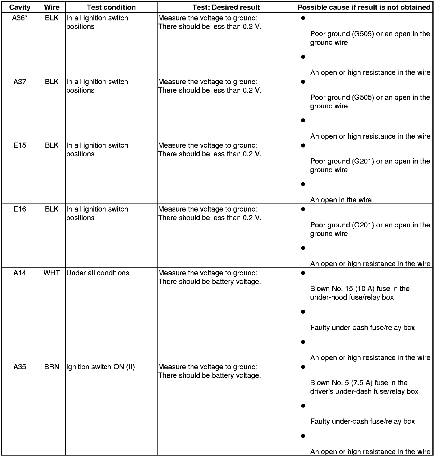 8. Reconnect the connectors to the passenger's under-dash fuse/relay box, and do these input tests at the following connectors.