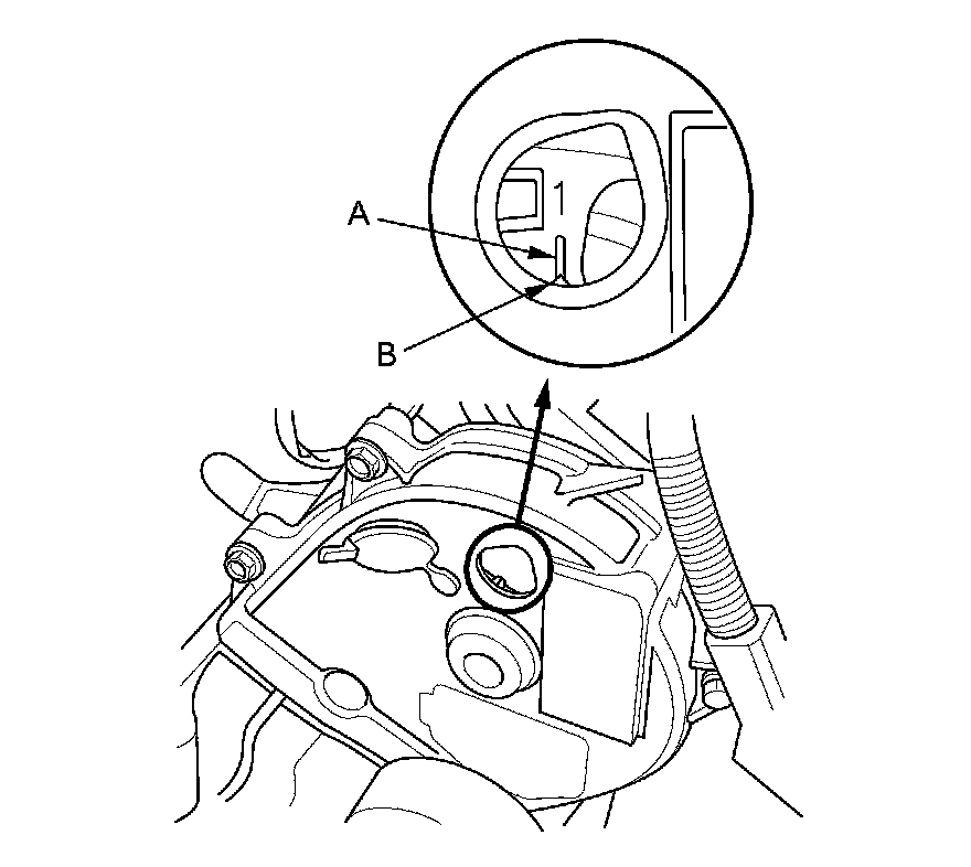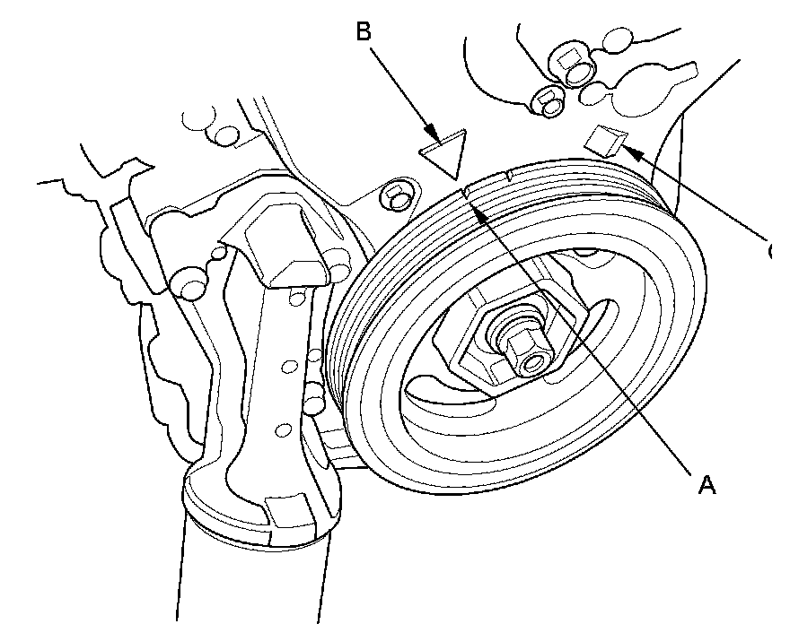1. Turn the crankshaft pulley so its white mark (A) on the crankshaft pulley lines up with the pointer (B).