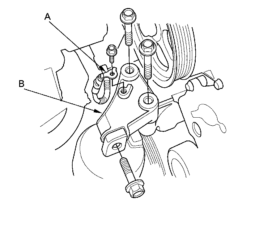 7. Remove the ground cable (A), then remove the upper half of the side engine mount bracket (B).