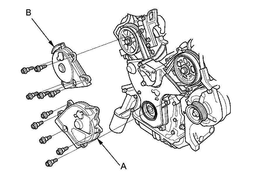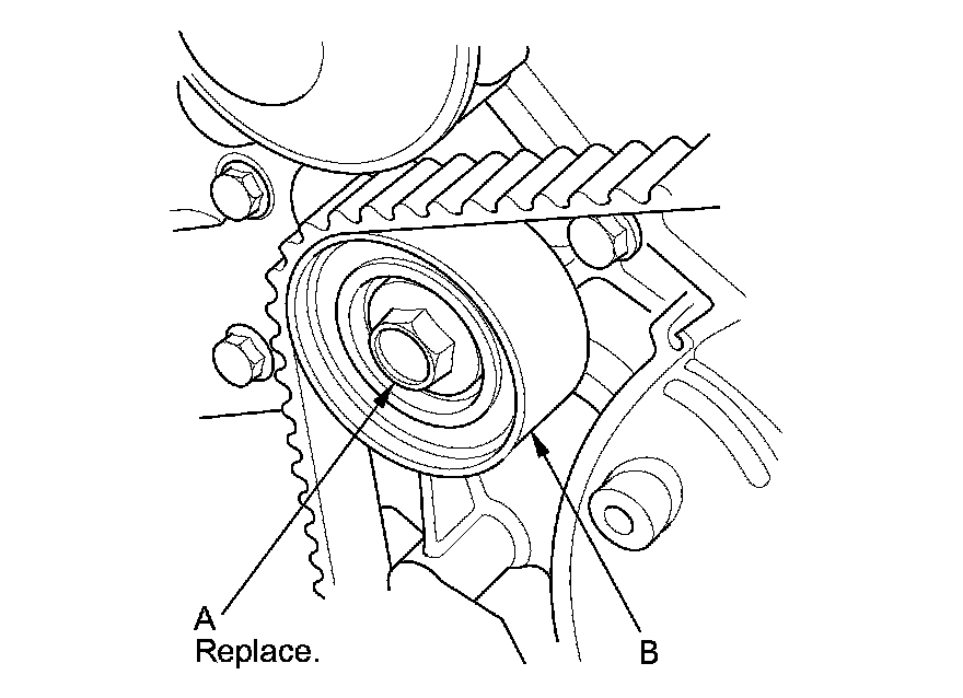 15. Remove the idler pulley bolt (A) and the idler pulley (B), then remove the timing belt. Discard the idler pulley bolt.