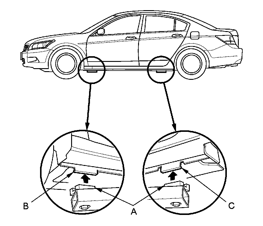 1. Position the lift blocks (A) under the vehicle's front support points (B) and rear support points (C).