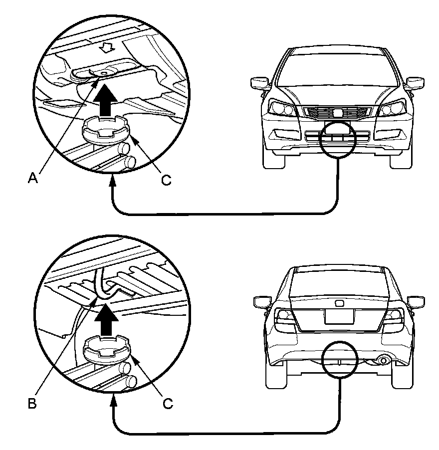 3. Position the floor jack under the front jacking bracket (A) or the rear jacking bracket (B). Center the jacking bracket on the jack lift platform (C), and jack up the vehicle high enough to fit the safety stands under it.