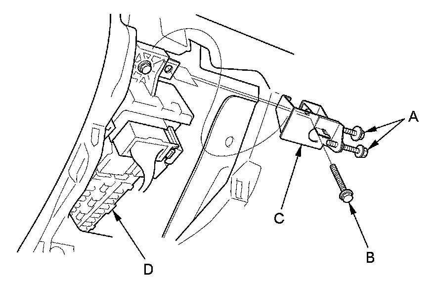 7. Remove the mounting bolt (C), release the tab(D), and pull the driver's under-dash fuse/relay box away from the body.