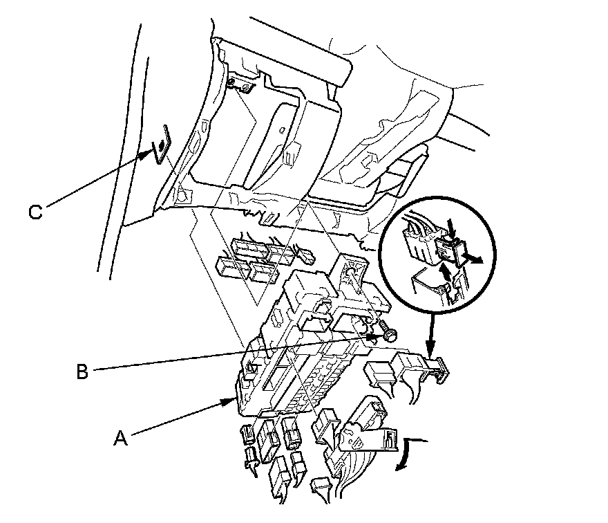 4. Remove the mounting bolt (B), release the tab (C), and pull the driver's under-dash fuse/relay box away from the body.