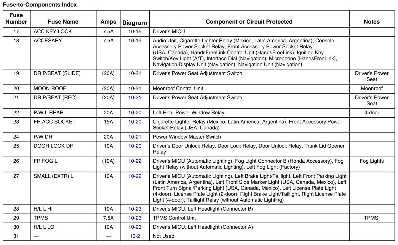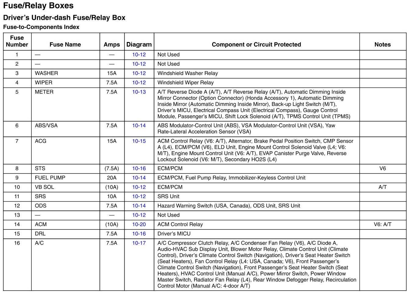 Driver's Under-dash Fuse/Relay Box - Fuse-to-Components Index