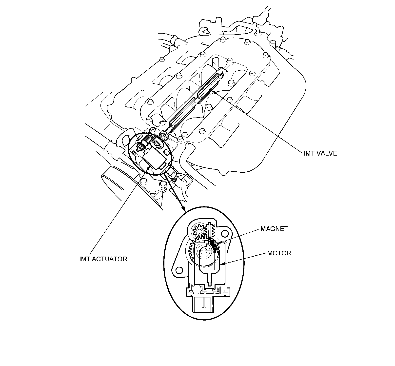 The intake manifold tuning (IMT) valve actuator has a sensor that detects the IMT valve position and sends it to the ECM.