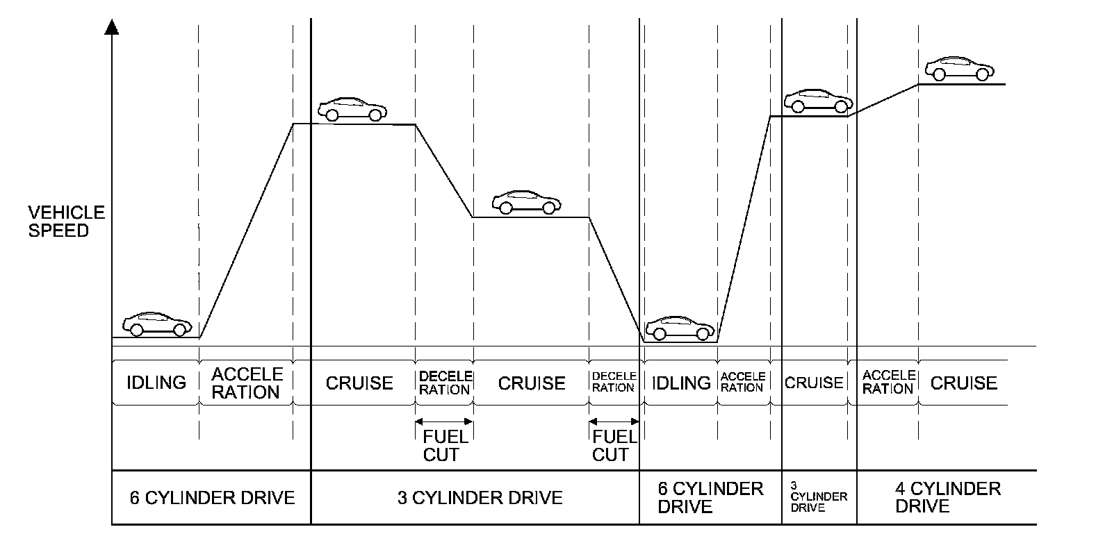 The VCM system activates the cylinders based on the driving condition. The system has three modes: 6 cylinder (all cylinder activation), 4 cylinder (pauses the No. 3 and No. 4 cylinder), and 3 cylinder (pauses the rear bank of cylinders). On paused cylinders, the intake and exhaust valves are kept closed. Since the valves are closed, the frictional losses from the valve spring compression and pumping are reduced because no air is compressed in the cylinder. This reduces engine drag.