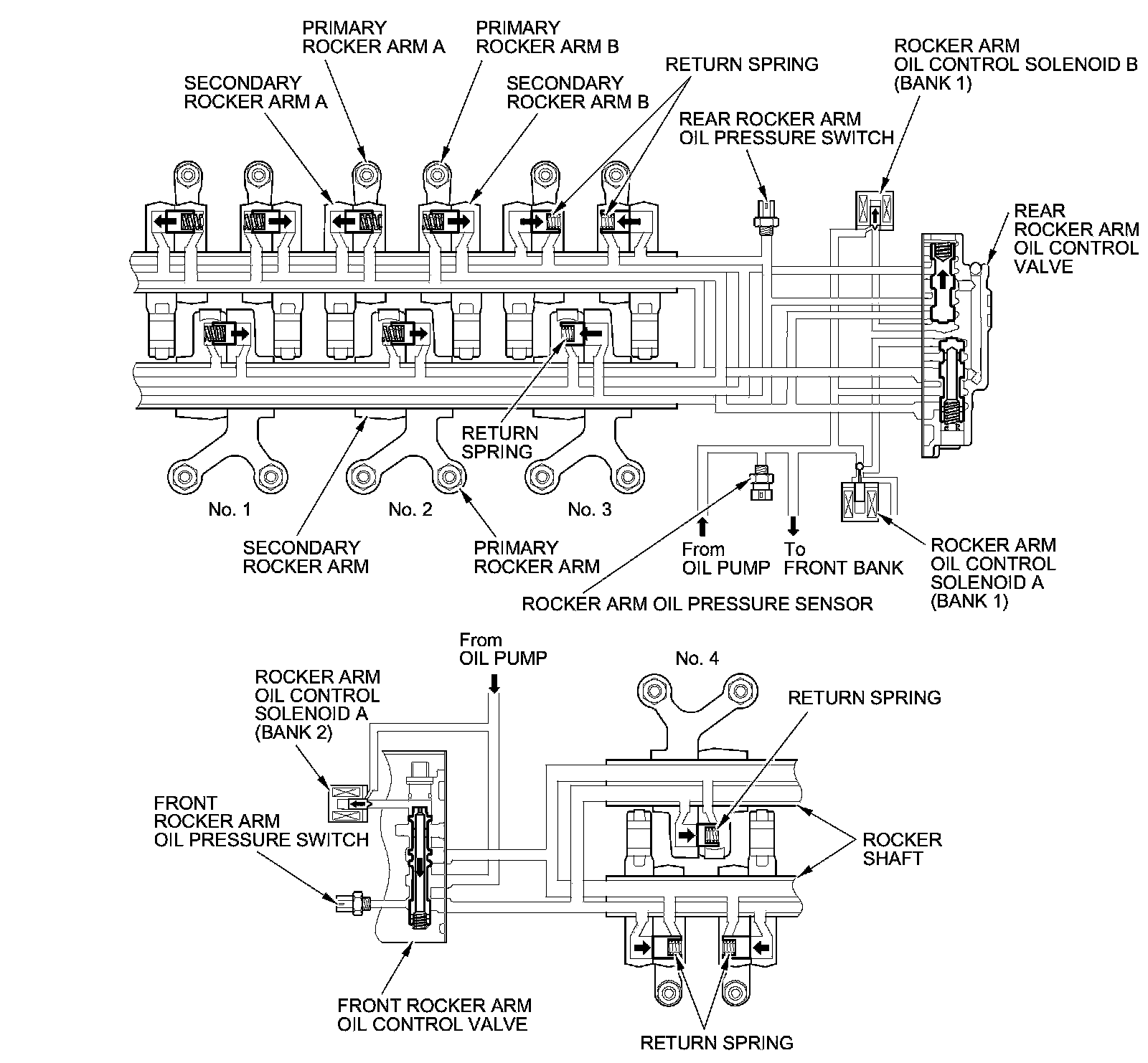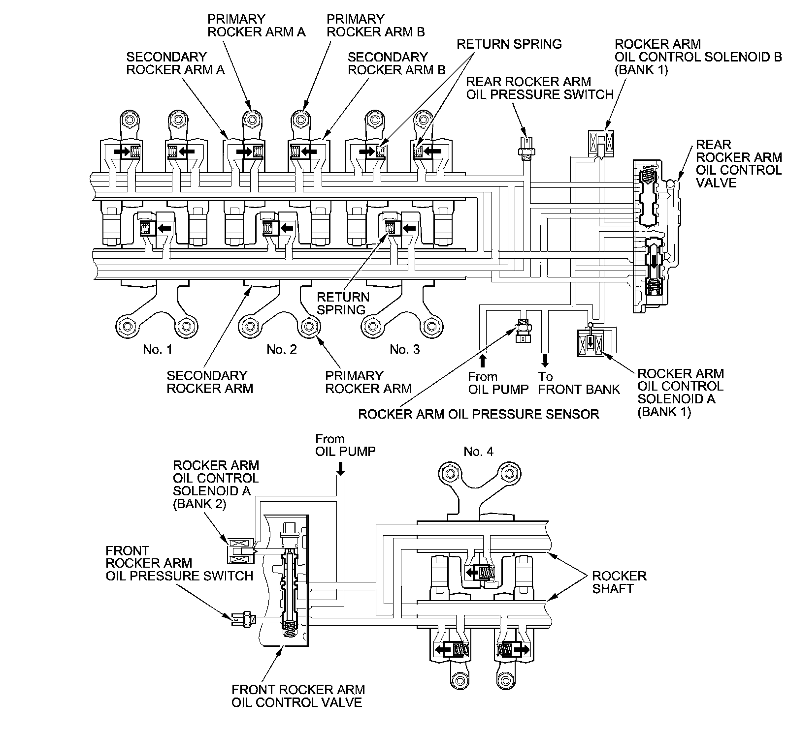 When rocker arm oil control solenoids B (Bank 1) and A (Bank 2) are turned on by PCM, the front and rear rocker arm oil control valves switch the oil pressure. Oil pressure then enters the No. 3 and No. 4 cylinder's secondary rocker arm from the oil passage in the rocker shaft, causing the VTEC switching piston to slide into the primary rocker arm and against the return spring. This disengages the secondary rocker arm from the primary rocker arm to stop valve activation. The No. 3 and No. 4 cylinder's rocker arms do not move, and the No. 3 and No. 4 cylinders are paused. In the other four cylinders, oil pressure from the front and rear rocker arm oil control valves lock the primary and secondary rocker arms together. The rocker arms are moved by the camshaft, and the four cylinders are active.