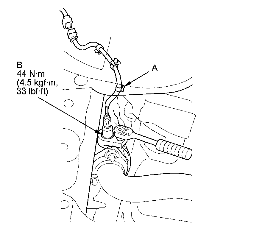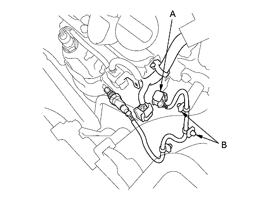 1. Disconnect the front secondary HO2S 4P connector (A), and remove the harness clamps (B).