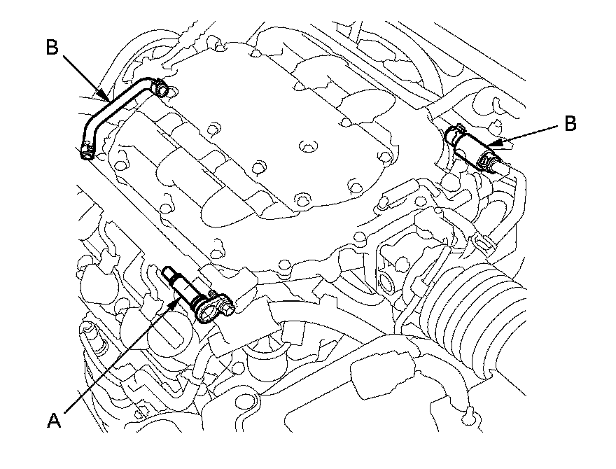 2. Check the PCV valve (A), hoses (B), and connections for leaks or restrictions.