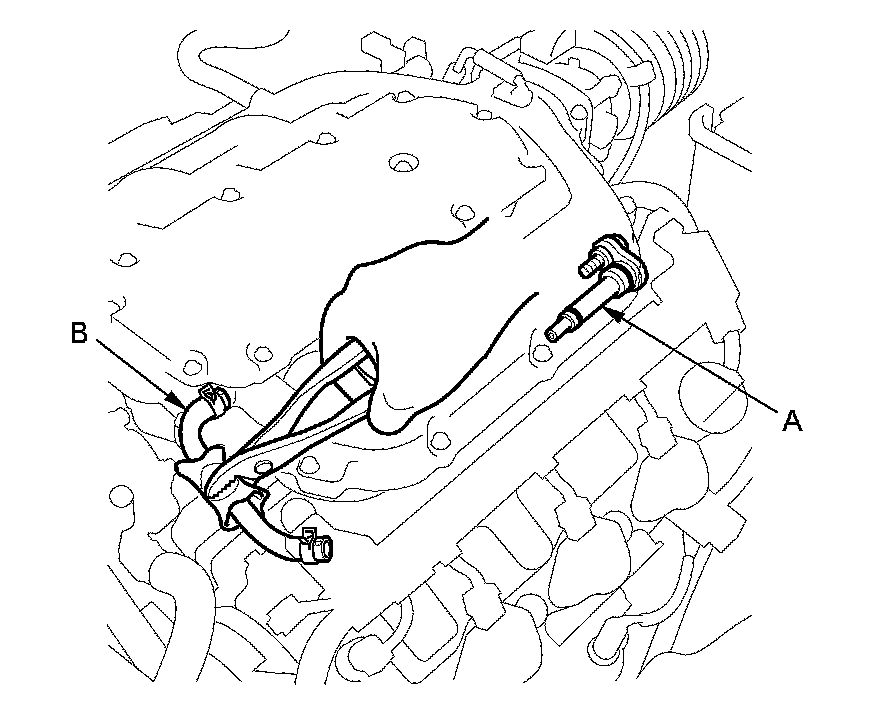 3. At idle, listen to the PCV valve (A) with a stethoscope as you lightly pinch the PCV hose (B) with your fingers or pliers several times. Each time the hose is pinched, the valve should click.