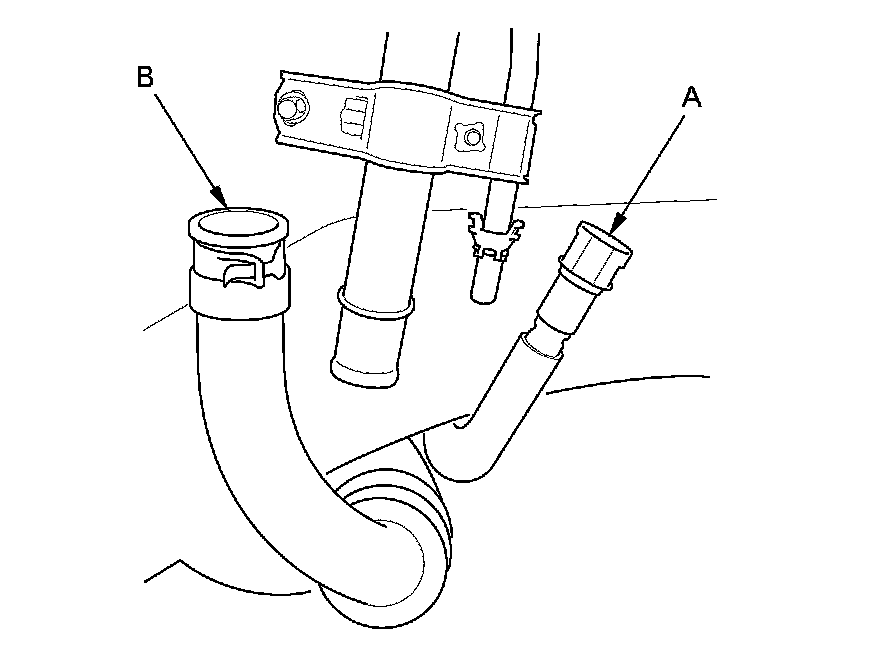 4. Disconnect the quick-connect fittings (A) Fuel Line/Quick-Connect Fitting Removal(and on all models except PZEV, disconnect the fuel fill tube (B) from the fuel fill pipe. Slide back the clamps, then twist the hose as you pull to avoid damaging them).