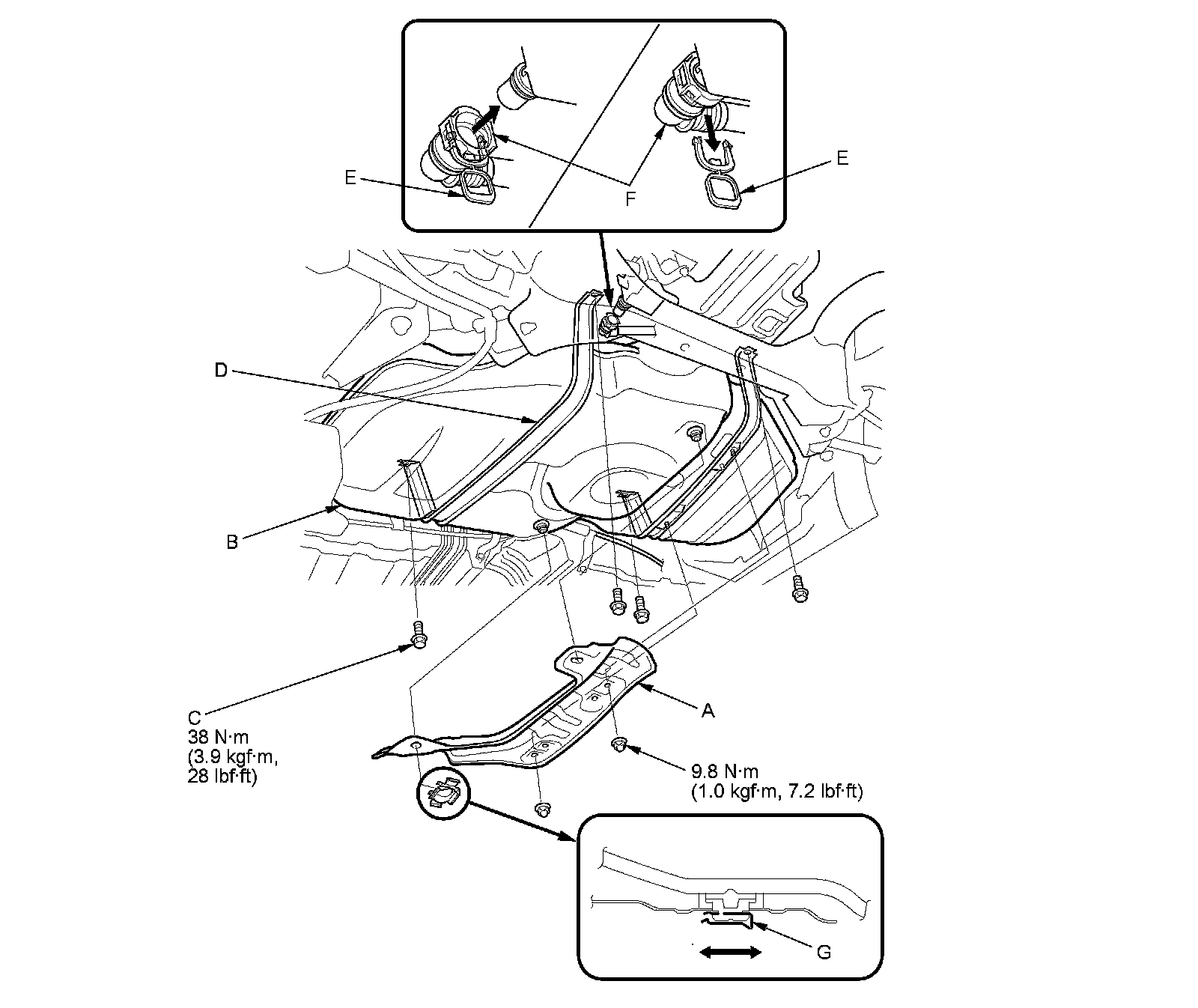 - When installing the fuel tank protector, make sure to insert it into the clip (G) in the direction shown.