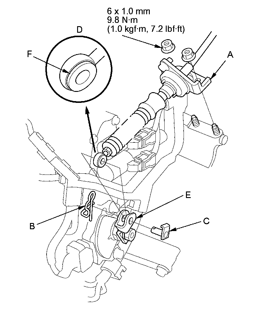 13. Check the bushing (F) in the shift cable end for proper fit and wear. If the bushing is loose or worn, replace the shift cable Service and Repair.
