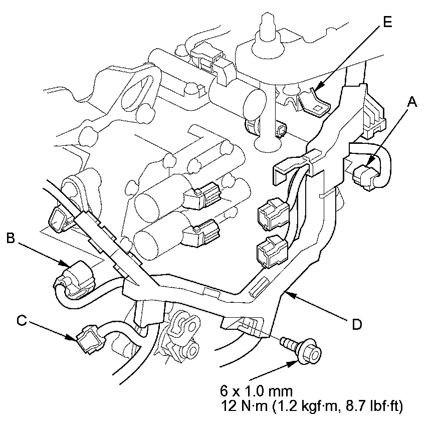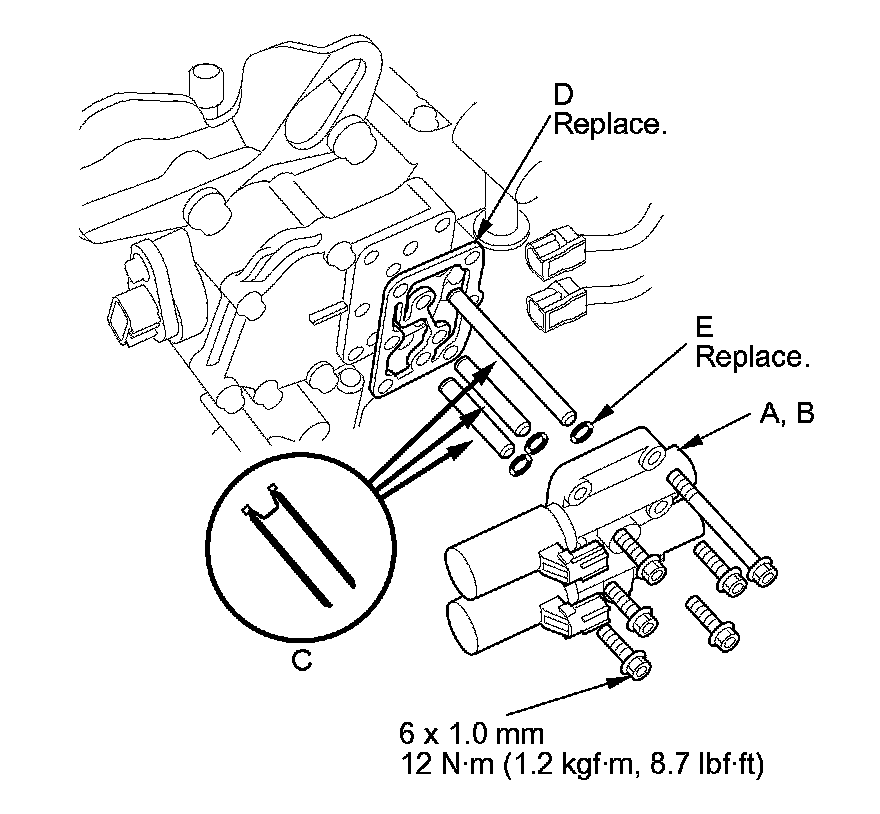16. Remove A/T clutch pressure control solenoid valves A and B, the ATF pipes (C), the gasket (D), and the O-rings (E).