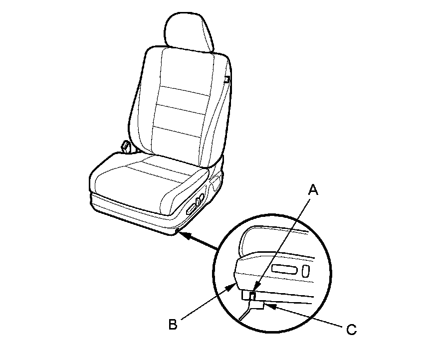 7. Using a piece of tape (A), mark the location on the seat's outer cover (B) where the front riser cover meets the seat riser (C). The driver's seat position sensor should read NEAR.