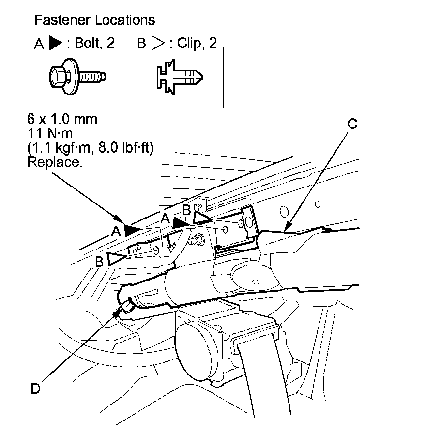 6. Remove the retractor mounting tapping screw (A) and the retractor bolt (B), then remove the center seat belt (C) and the retractor (D). 4-door is shown; 2-door is similar.