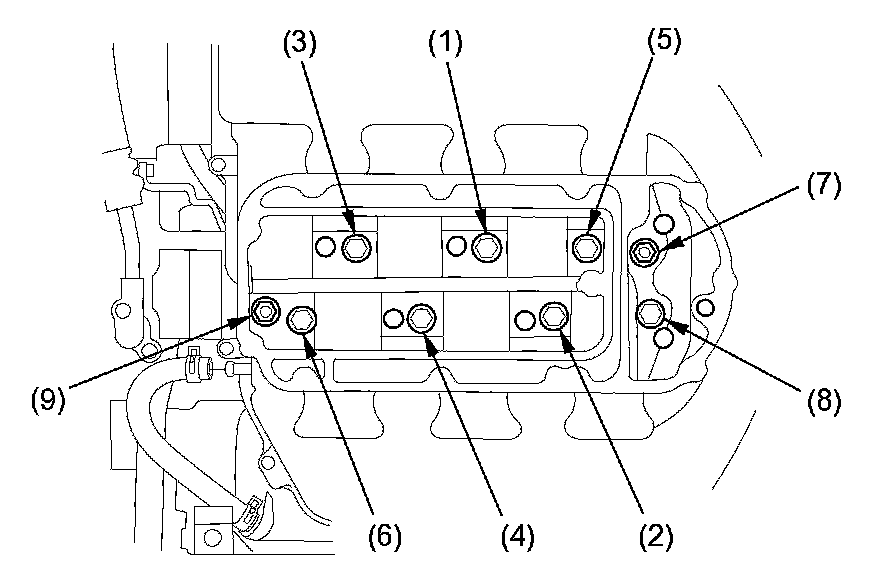Injector Base 22 Nm (2.2 kgf-m, 16 ft lb)Tighten the injector base mounting bolts/nuts in a crisscross pattern in three steps, beginning with the inner nuts