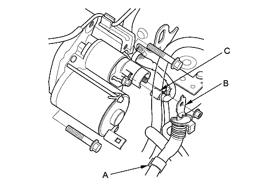 5. Disconnect the positive starter cable (B) and the S terminal connector (C).