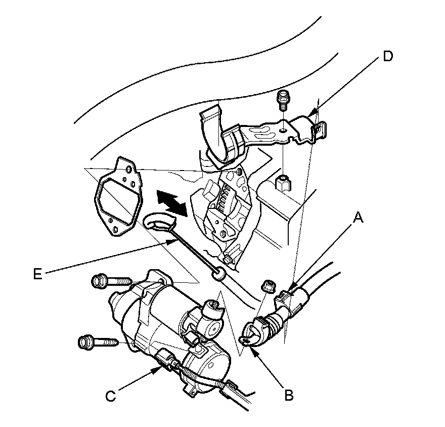 3. Connect the positive starter cable (D) and the S terminal connector (E). Make sure the crimped side of the ring terminal faces away from the starter when you connect it.