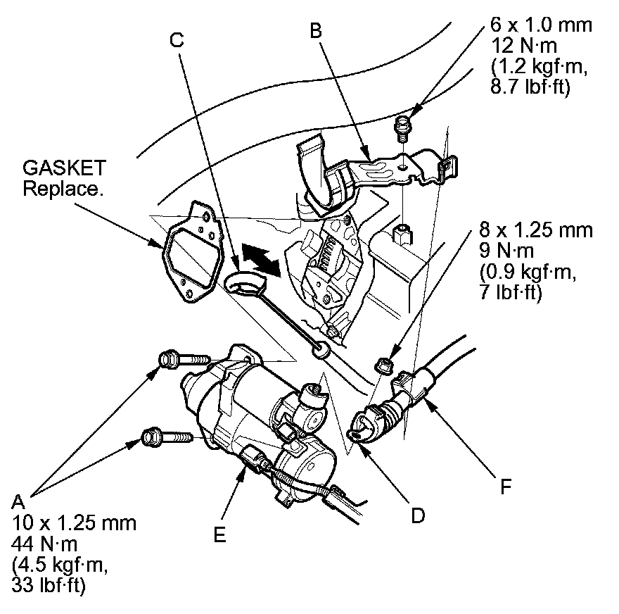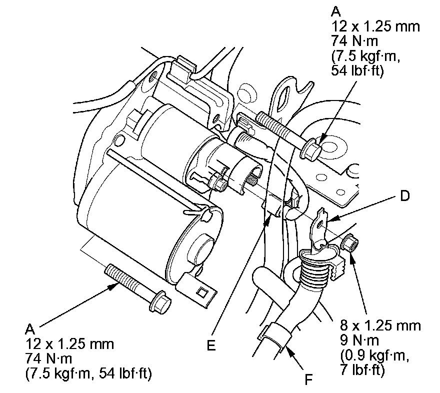 1. Install the starter, then tighten the mounting bolts (A).