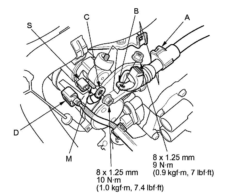 4. Remove the harness clamp (A), then disconnect the positive starter cable (B), the motor wire (C), and the S terminal connector (D).