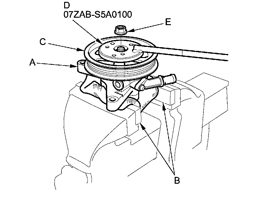 3. Hold the power steering pump (A) in a vise with soft jaws (B), then hold the pulley (C) with the pulley holder (D), and remove the pulley nut (E) and pulley. Be careful not to damage the pump housing with the jaws of a vise.