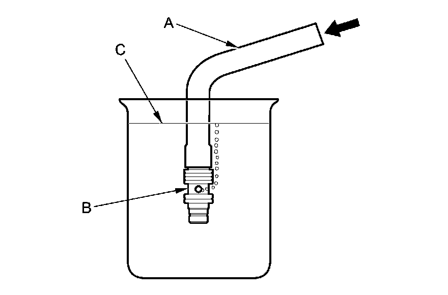 14. Attach a hose (A) to the end of the flow control valve (B) as shown. Then submerge the flow control valve in a container of power steering fluid (C), and apply compressed air in the hose.