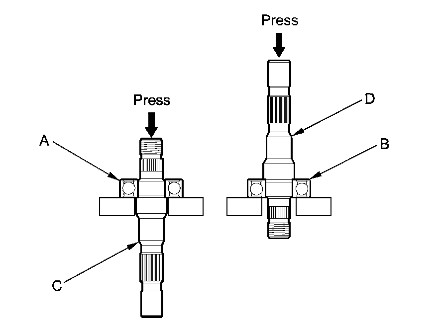 16. Inspect the driveshaft by rotating the inner race slowly. If you feel any play (axial or radial), remove the worn driveshaft (C), and install a new driveshaft (D).