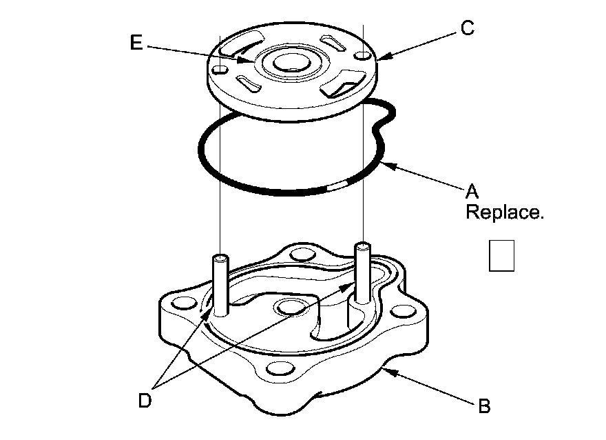 27. Install the side plate on the cam ring (C) by aligning the roll pin set holes (D) in the side plate with the roll pins (E).