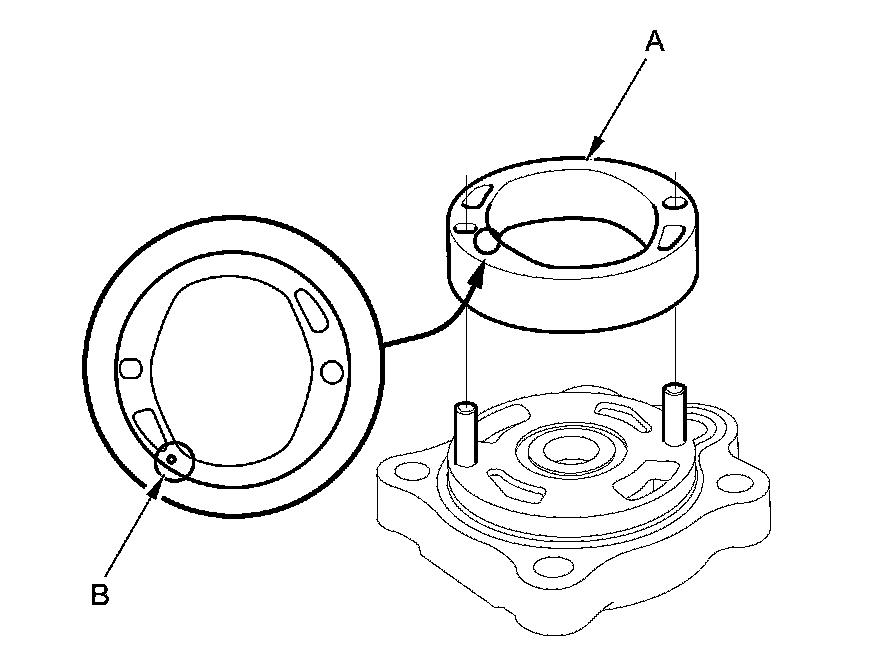 26. Coat the new 15.2 mm O-ring (A) with power steering fluid, and install it into the groove in the side plate (B).