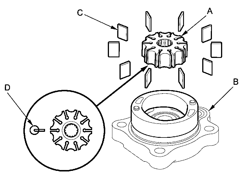 25. Set the 10 vanes (C) in the grooves in the rotor. Make sure that the round ends (D) of the vanes are in contact with the sliding surface of the cam ring.