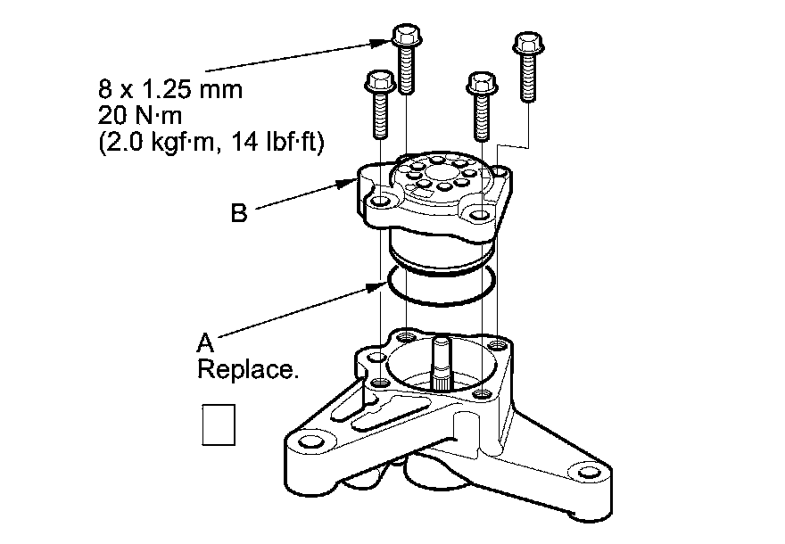 29. Install the pump cover assembly (B) in the pump housing. Tighten the bolts to the specified torque alternating in two or more steps.