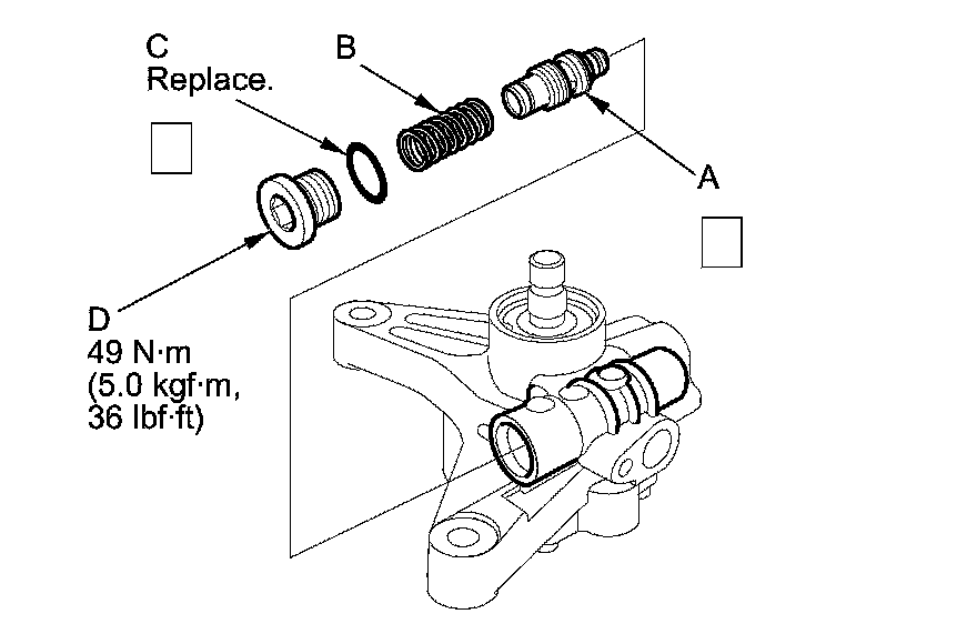 31. Coat the new 16.7 mm O-ring (C) with power steering fluid, and install it on the flow control valve cap (D), then install the cap on the pump housing. Tighten it to the specified torque.
