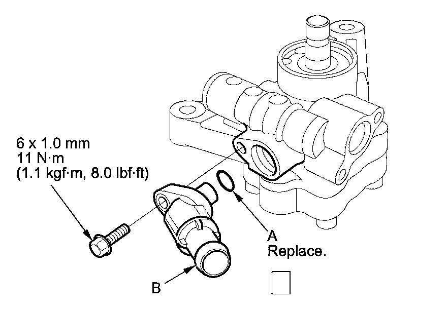 32. Coat the new 14.8 mm O-ring (A) with power steering fluid, and install it on the inlet joint (B). Install the inlet joint on the pump housing.