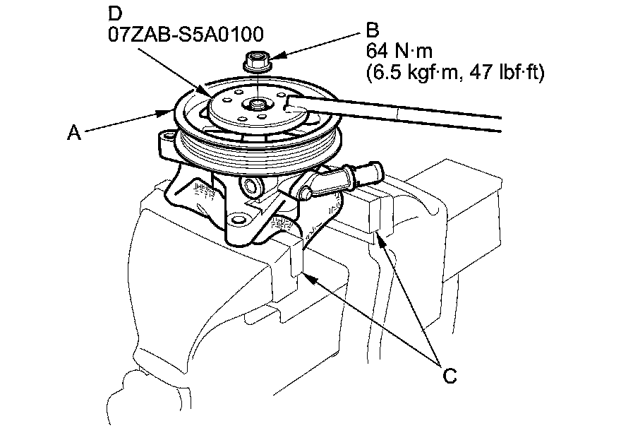 34. Hold the pulley with the pulley holder (D), and tighten the pulley nut to the specified torque.