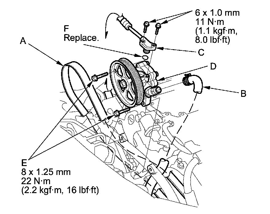 6. Remove the pump mounting bolts (E), then remove the pump.