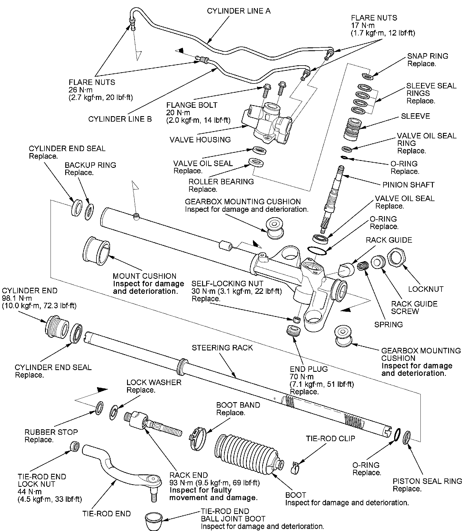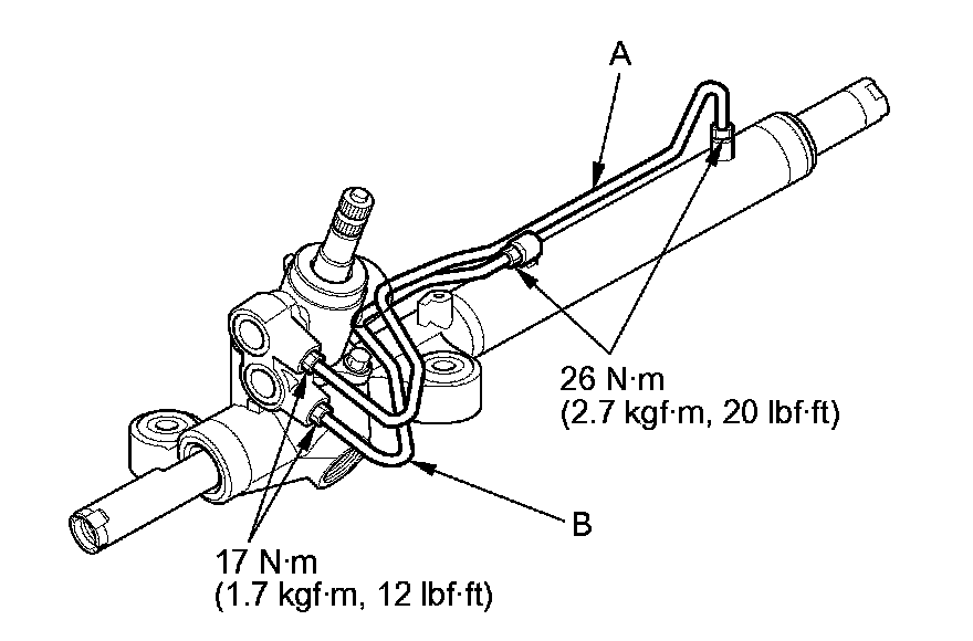 64. Coat the inside surface of the cylinder end (A) with power steering fluid, then install the cylinder end by screwing it into the cylinder (B). Tighten the cylinder end to the specified torque.