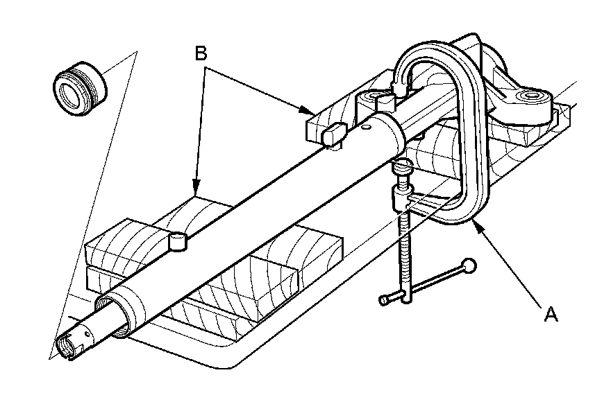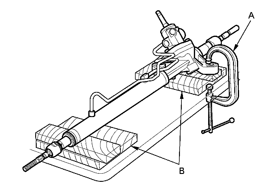 6. Hold the gearbox housing using a C-clamp (A) and wooden blocks (B) to a work bench as shown. Do not clamp the cylinder part of the gearbox housing in a vise.
