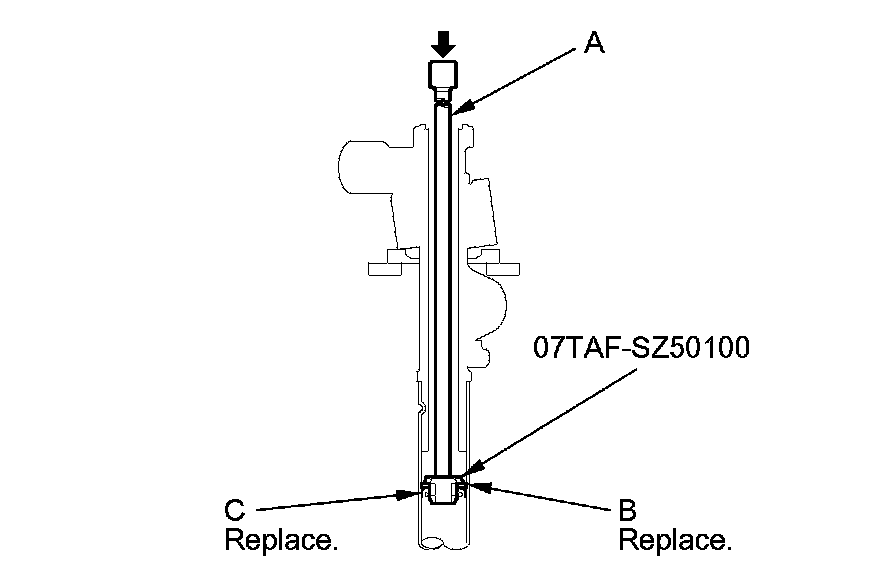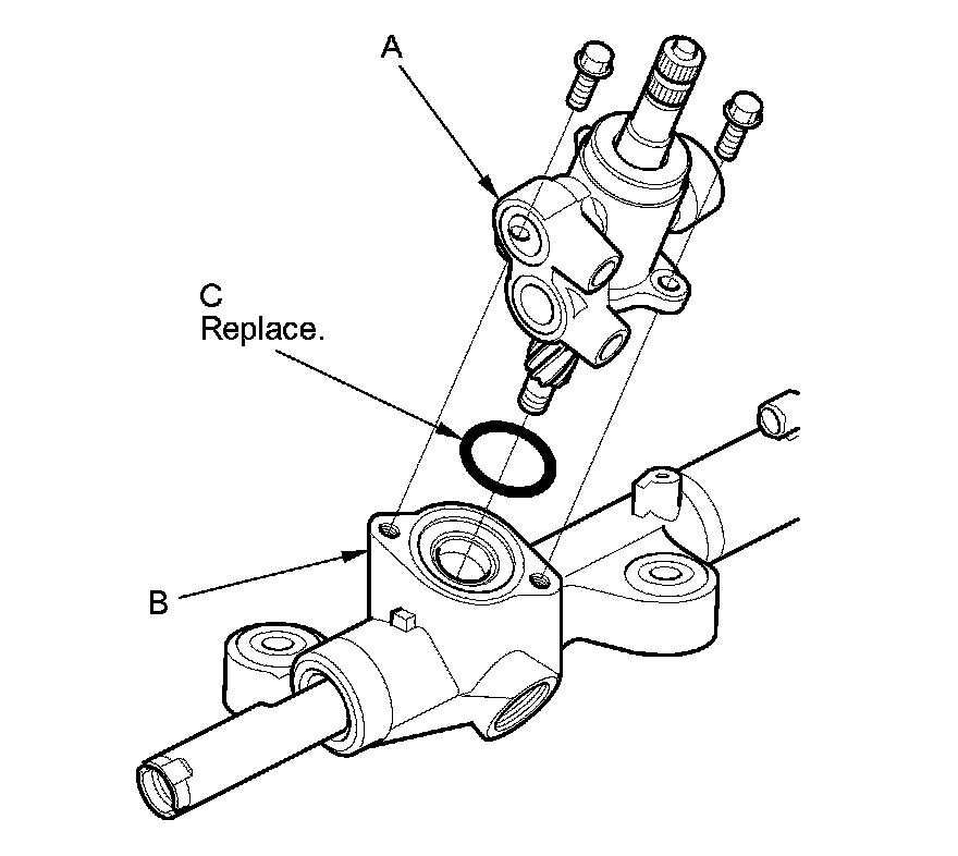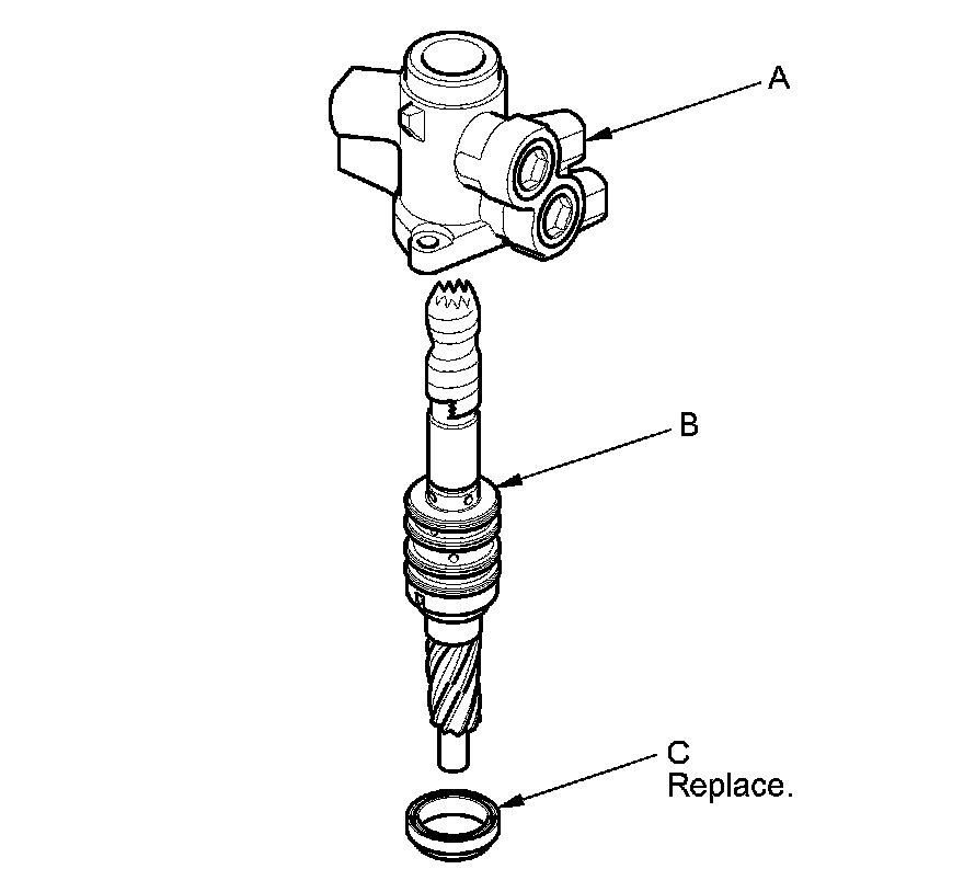24. Separate the valve housing (A) from the pinion shaft/sleeve (B) and the valve oil seal (C).