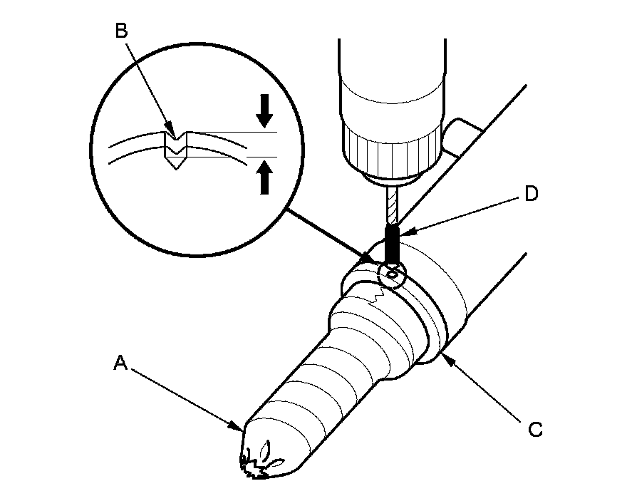 3. Drill a 4.0 mm (0.16 in) diameter hole about 2.5-3.0 mm (0.10-0.12 in) in depth in the staked points (A) on the end plug (B) and the gearbox housing (C).