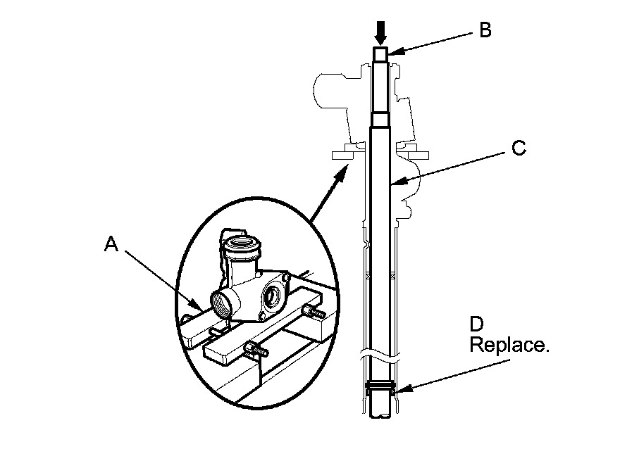 22. Insert a 24'' long 3/8'' drive extension (A), on the cylinder end seal remover attachment. Place the gearbox housing in a press, then remove the backup ring (B) and cylinder end seal (C) from the gearbox housing by pressing on the 24'' long 3/8'' drive extension.