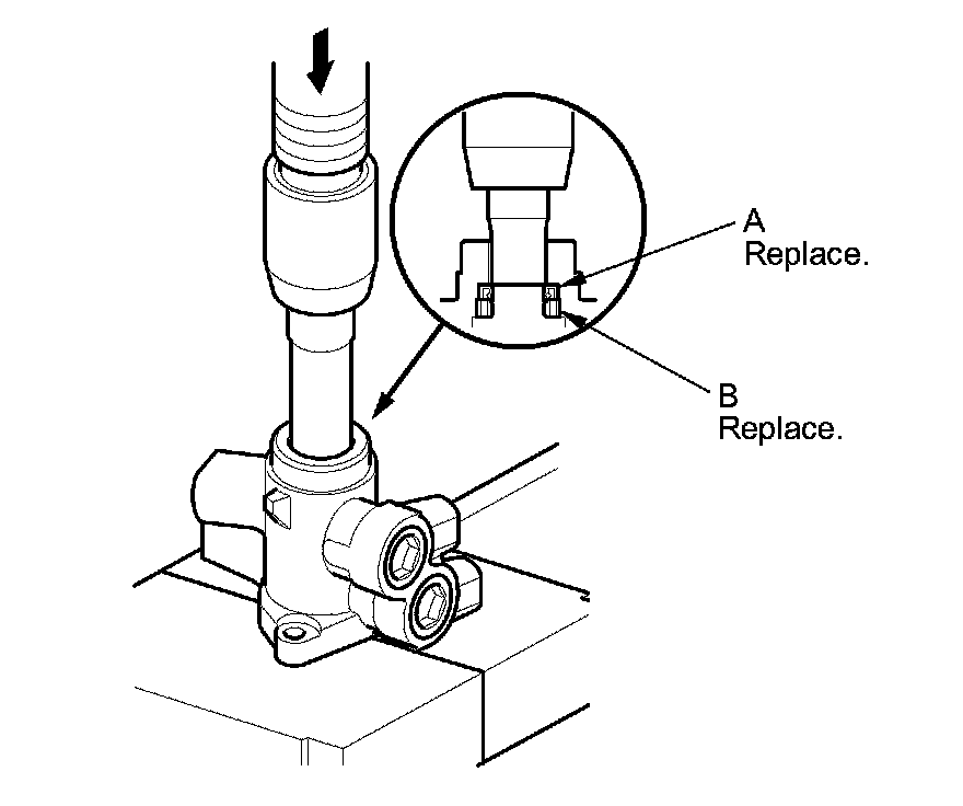 42. Apply power steering fluid to the seal ring lip of the new valve oil seal (A), then install the seal in the valve housing (B) using a hydraulic press and driver handle. Install the seal with its grooved side facing the tool.